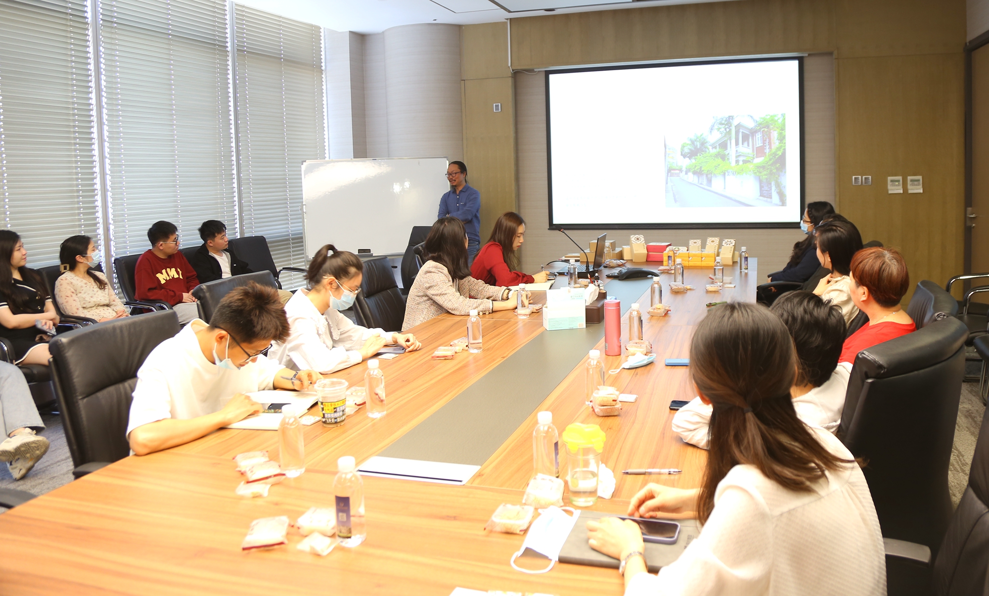 當天下午,集團前臺工作人員為楊函憬送上鮮花,迎接他的到來。會議室也布置了許多花磚元素的美食和冰箱貼,供到會同事品嘗和領(lǐng)取。