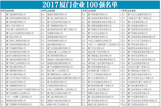 廈門企業(yè)100強(qiáng)和服務(wù)業(yè)企業(yè)十強(qiáng)排行榜首位
